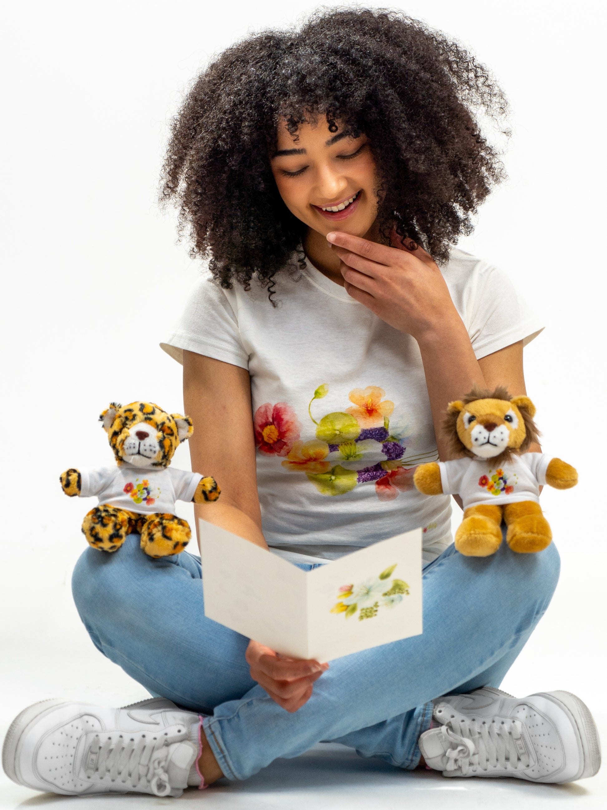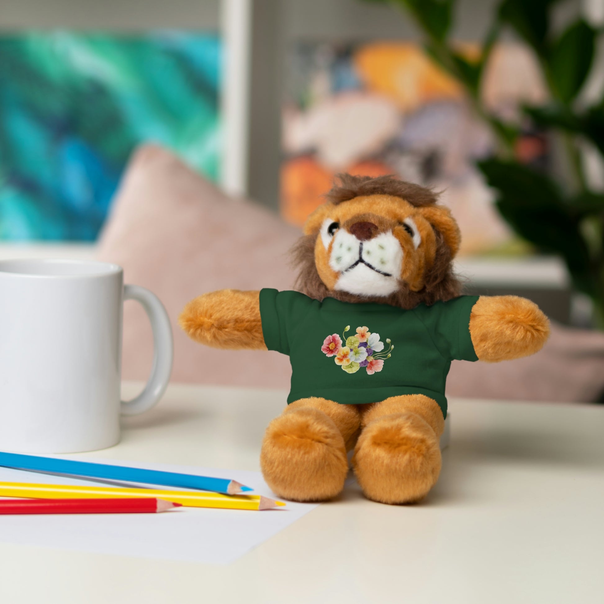 Created to put ear-to-ear smiles on any child, these stuffed animals have a playful attitude. Each plushie is 8" tall, and features polyester and plastic pellet stuffing, while their tees are 100% cotton. Available animals: Panda, Lion, Bear, Bunny, Jaguar, and Sheep.